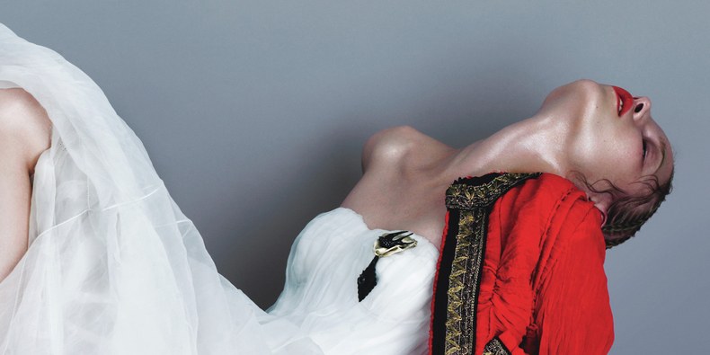 Take the mascara and then you dip your fingers in water, then you mush, mush, mush to get a proper smokey eye and then cry so you’ve tears of mascara running down. A little brow furrow would be good. I think it’s the tears dropping with black mascara at the bottom would be the most dramatic. Sort of sexy trash but refined, sexy, editorial trash.