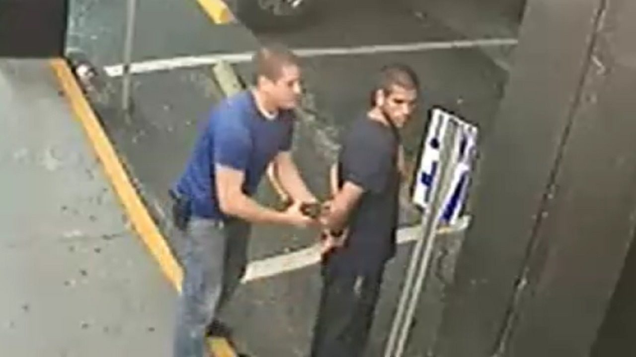 Surveillance video first shows the assailants waiting for the victim to come out of the store before they confronted him and told him he was under arrest. The victim said he believed the men were law enforcement and complied with their requests.